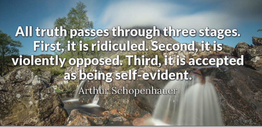 Why? Why do humans respond to truth in such a way? We seek truth, we claim to be willing to climb the highest mountain or swim the deepest sea to find truth. But when we find it, we first ridicule it. Then we violently oppose it, and finally accept it as being self evident.